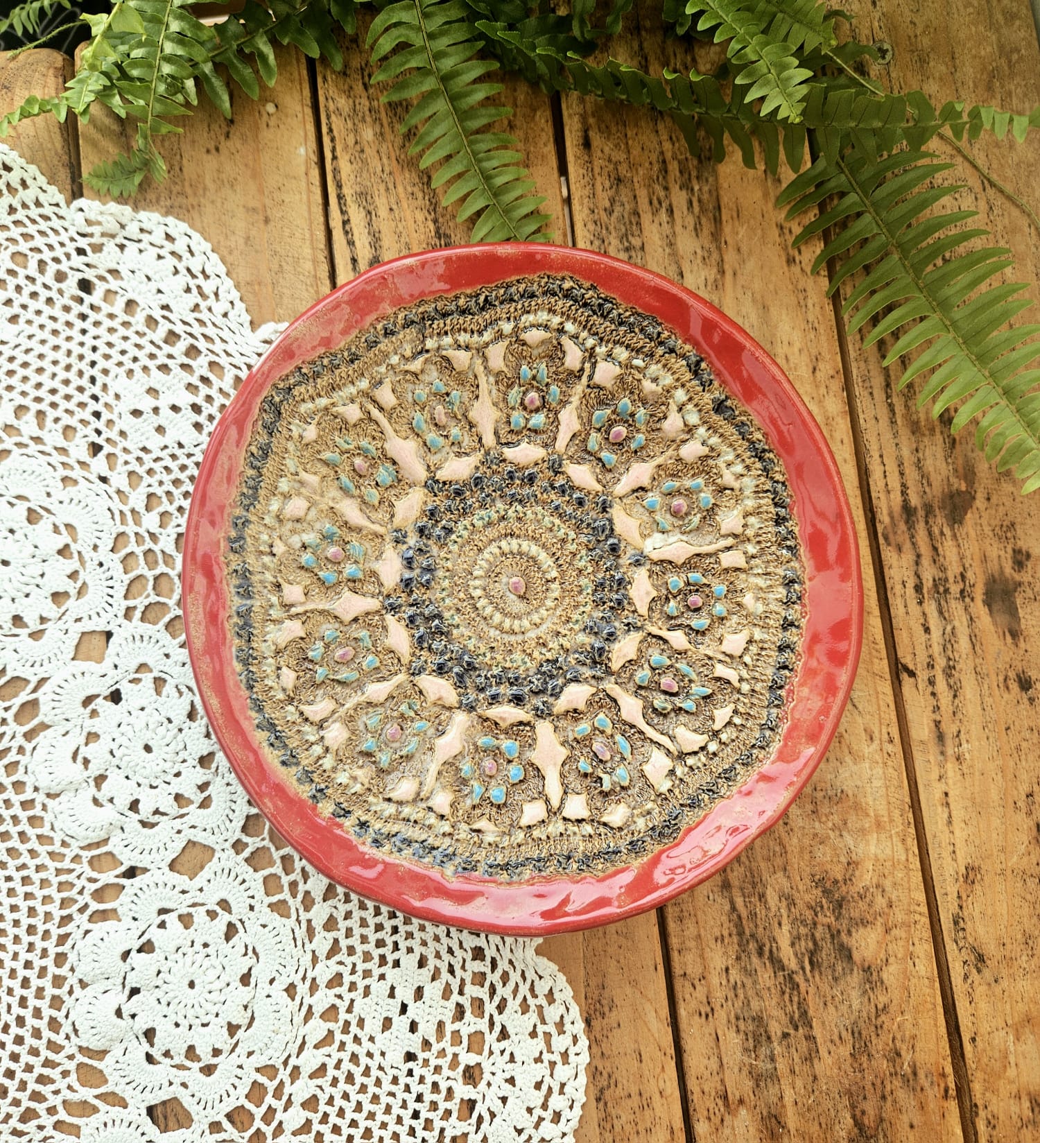 Beautiful ceramic plates with printed crochet patterns and hand-painted with care. Each piece is unique and available in various sizes, perfect for serving or display.